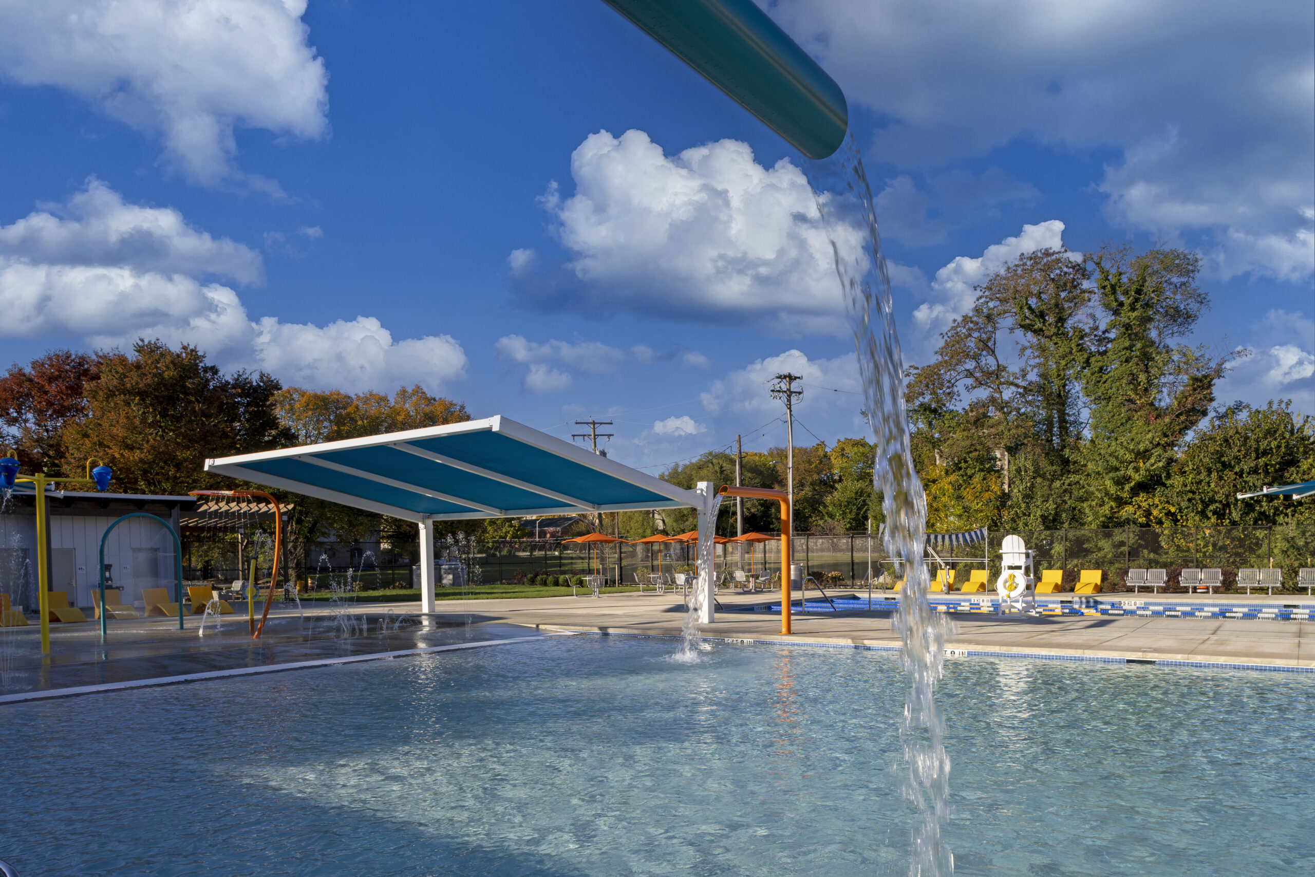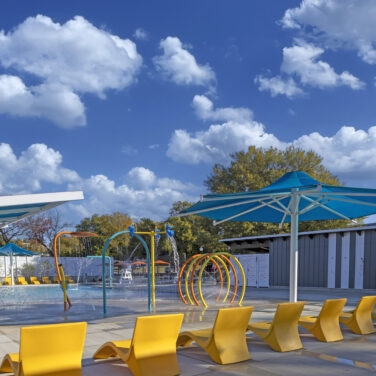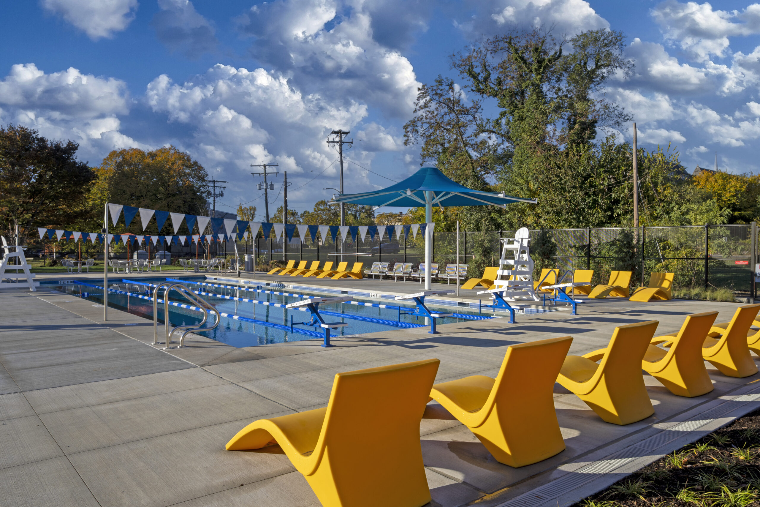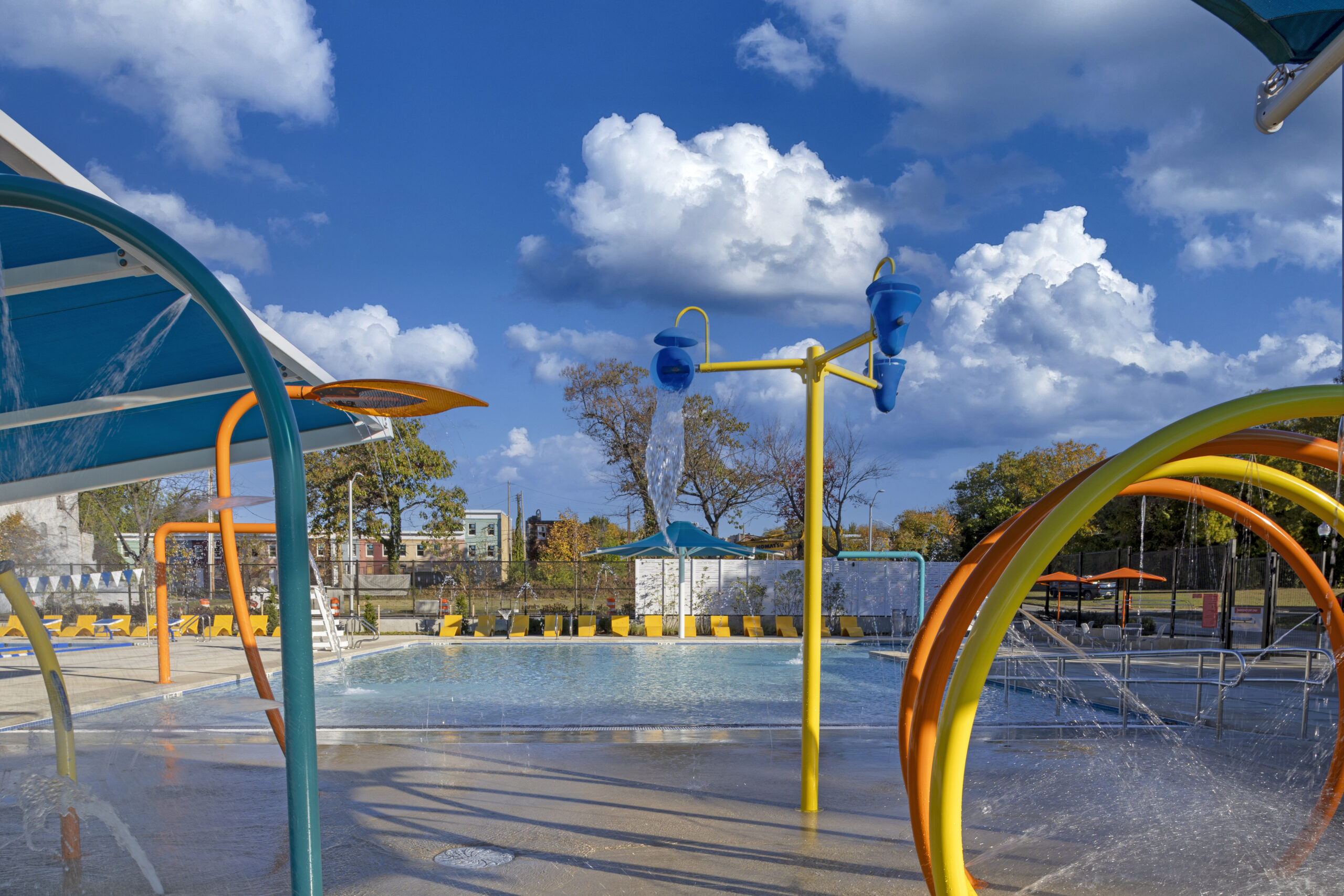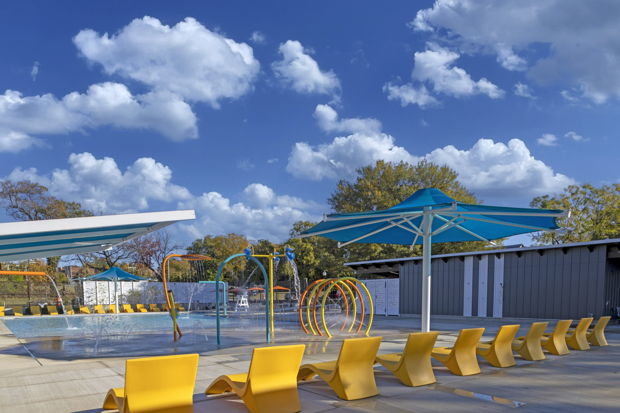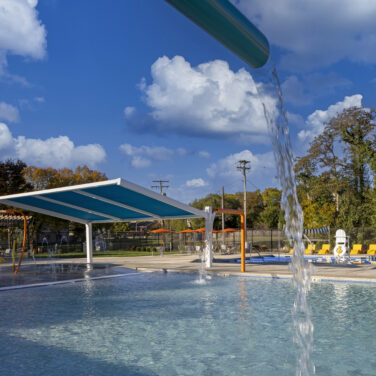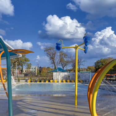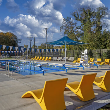 Project Description: Greater Model Aquatic Center in Baltimore’s southwest Poppleton neighborhood is a vibrant new aquatic center featuring a six-lane lap pool, a family pool with beach entry, and a splash pad with eight interactive spray features. The project included demolition of the old pools and construction of a bathhouse with four private restrooms, a pool office, and a pumphouse to support smooth operations. Expansive pool decks with lounge chairs, tables, shade structures, and ornamental fencing create a safe and inviting environment, while an outdoor mister area adds extra fun and cooling for the whole community.